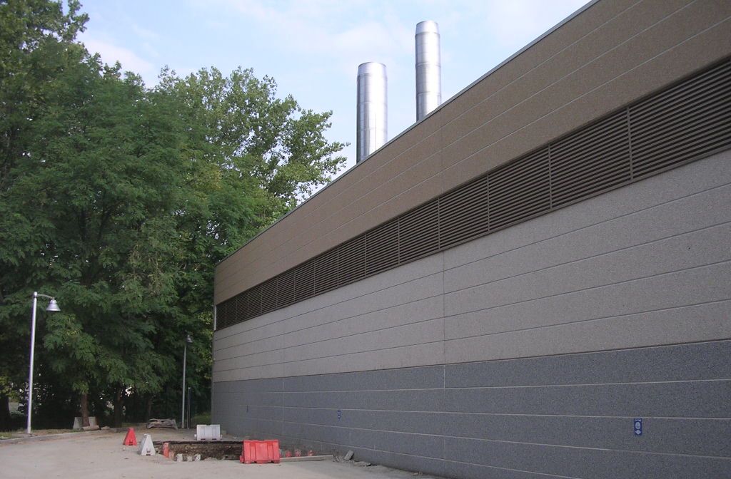- uno è al servizio di un cogeneratore a gas di potenza elettrica pari a 3.044 kWe - 3.119 kWt, di diametro nominale interno pari a 900 mm e si sviluppa per una altezza pari a 21,00 m dal piano di calpestio della centrale termica;