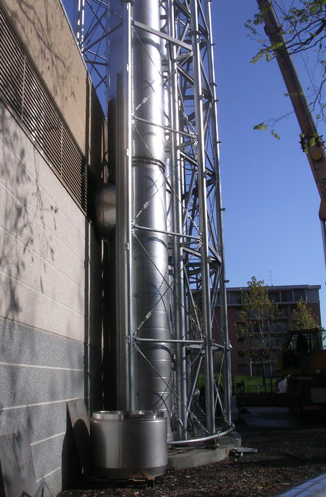 La progettazione dell'impianto ha implicato una collaborazione costante, sia con il progettista delle opere edili, sia con il costruttore della struttura metallica di contenimento dei camini, con i quali sono stati definiti i vari sistemi di fissaggio.
