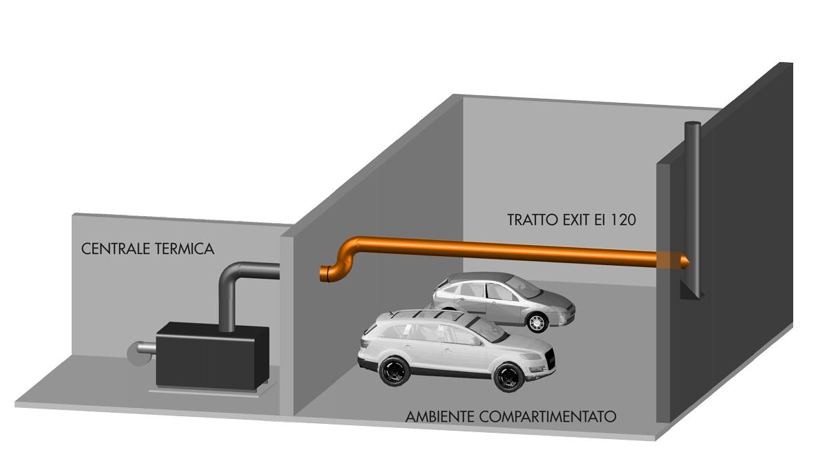 Impiegato come sistema di evacuazione fumi compartimentato, EXIT associa le sue proprietà di alta resistenza al fuoco (EI 120) alle caratteristiche tecniche di Conix Duo (T600 HI W V2 L50040 G50), il sistema camino a doppia parete di Camini Wierer progettato per consentire la risoluzione di qualsiasi problema di evacuazione fumi per impianti civili e industriali con temperature di esercizio fino a 600°C e punte massime di 1000°C, assicurando altissima tenuta ai fumi e alle condense anche con pressioni fino a 5000 Pa.